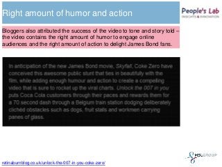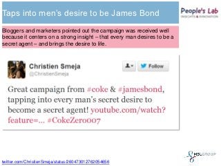 The 'unlock the 007 in you' campaign, developed by duval guillaume modem, focused on anyone buying a coke zero at belgians antwerp station. However, the exclusive tickets weren't free. Unlock the 007 in you: When buying a coke zero people were challenged to a 70 second dash to another platform in order to claim their free tickets to see the film skyfall. Nov 12, 2014 · stimulate positive word of mouth.